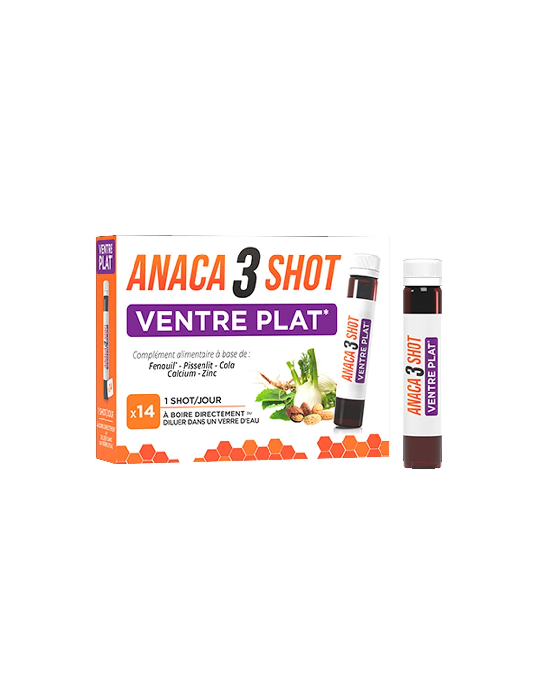 Anaca 3 Shot Ventre Plat est un complément alimentaire composé de fenouil, pissenlit, cola, calcium et zinc pour aider à diminuer les ballonnements, aider à soutenir le drainage, faciliter la digestion et aider à brûler les graisses.