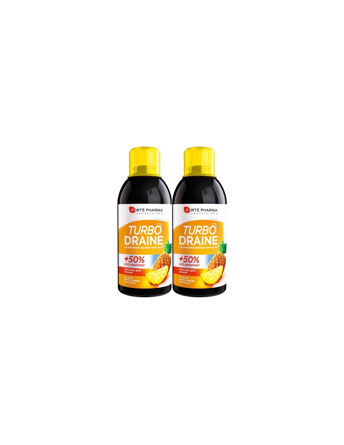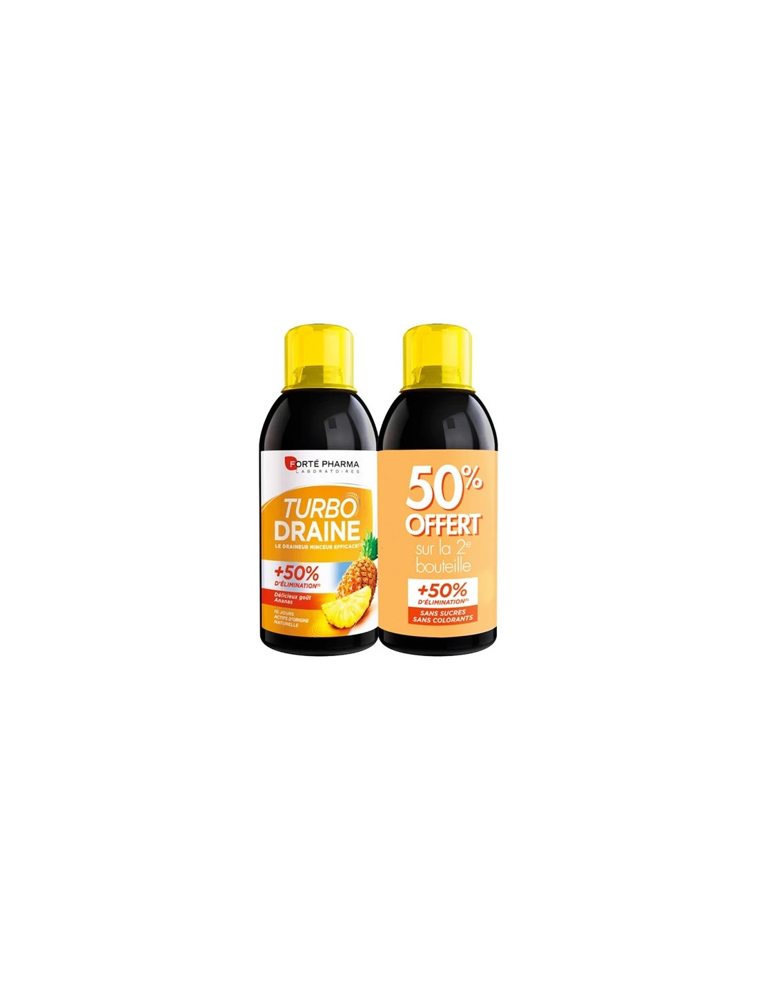 Offre spéciale Forté Pharma : le lot de 2 flacons de draineur Turbodraine Goût Ananas en promotion avec -50% sur le 2e flacon de ce lot !