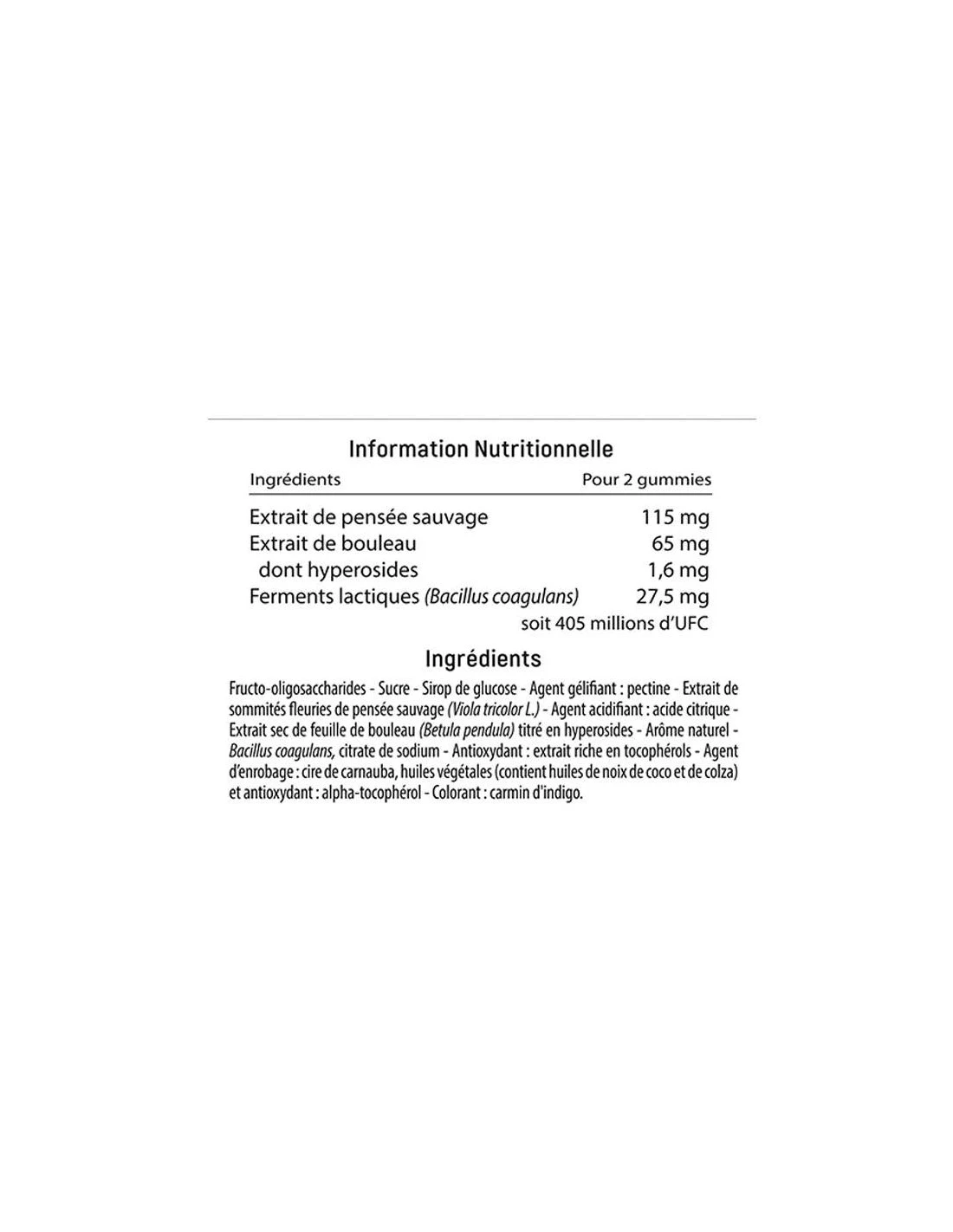 Fructo-oligosacchrides, Sucre, Sirop de Glucose, Extrait de Sommités Fleuries de Pensée Sauvage (Viola Tricolor L.), Agent Gélifiant : Pectine, Agent Acidifiant : Acide Citrique, Arôme Naturel de Pomme avec d’autres Arôme Naturels, Extrait Sec de Feuille de Bouleau (Betula Pendula), Bacillus Coagulans, Arôme Naturel, Citrate de Sodium, Antioxydant : Extrait Riche en Tocophérol, Agent d’Enrobage : Cire de Carnauba, Huiles Végétales (contient Huiles de Noix de Coco et de Colza) et Antioxydant: Alpha-Tocophérol, Colorant : Carmin d’Indigo.