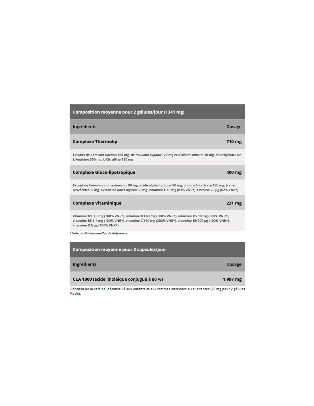 -Le Complexe Thermolip est une association d’acides aminés et d’extraits végétaux, dont le guarana et le thé vert qui stimulent la thermogenèse, favorisant ainsi l’amincissement en complément de mesures diététiques.