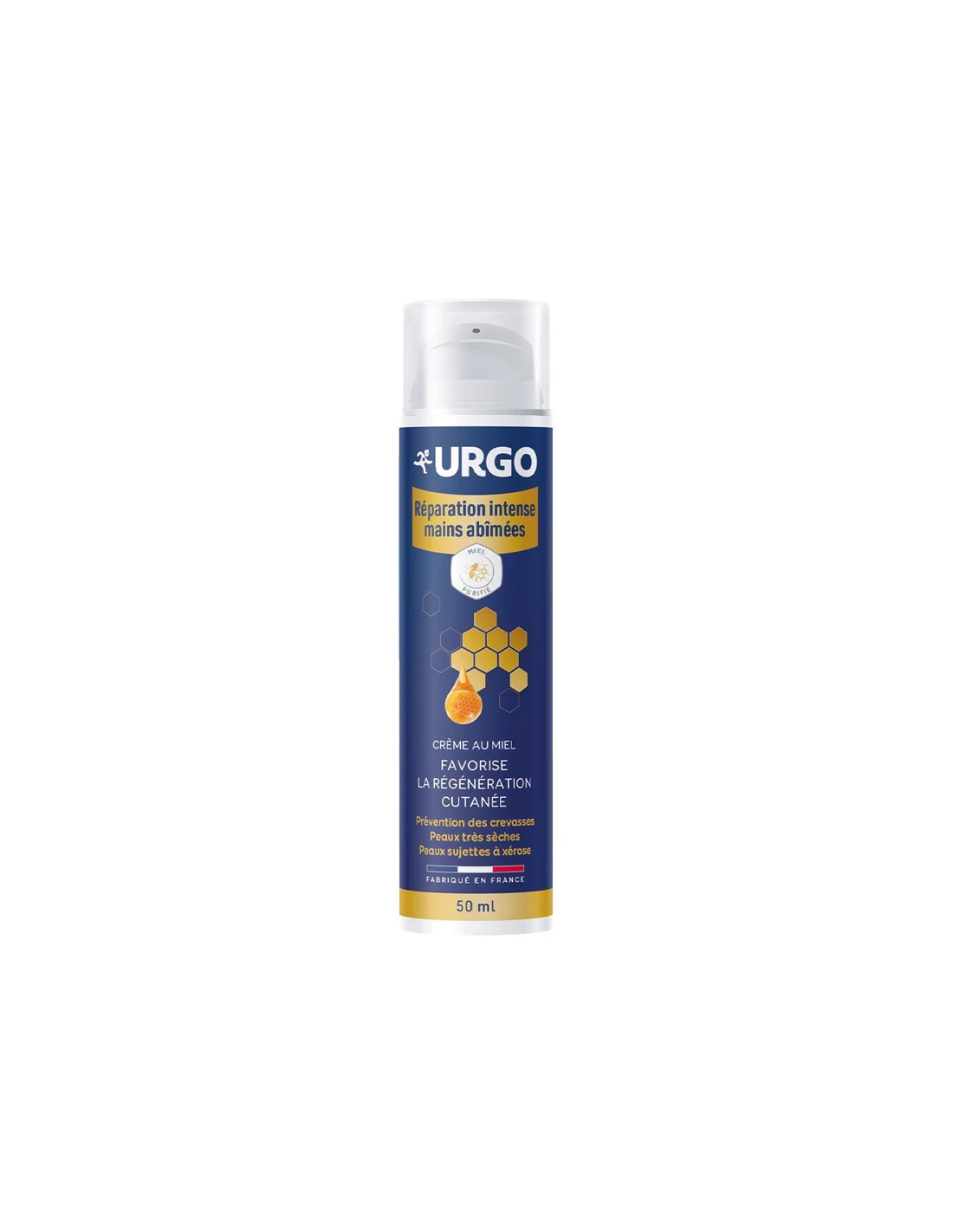 URGO Réparation Intense Crème Mains Miel nourrit intensément la peau, favorise la régénération cutanée et hydrate dès l’application et pendant 24h.